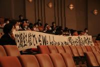 初めの学年合唱では合唱曲『信じる』を歌い上げます。3年生の先生たちは観客席で横断幕(先生たちのお手製です)を掲げ、見守ります。