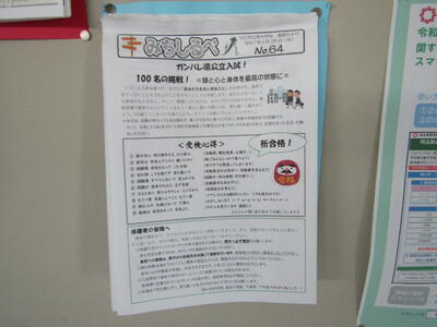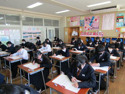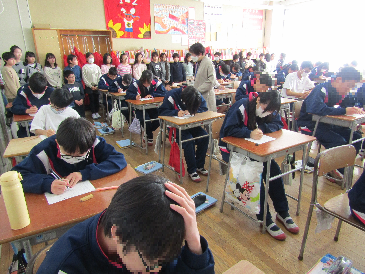 本日は、埼玉県公立高校入試(学力検査)が行われています。明日は実技検査・面接(一部の学校)が行われます。受検している全ての3年生が、これまでの成果を発揮できるよう、応援しています。1・2年生は、学年末テスト(1日目)を実施しています。1・2年生の皆さんも頑張ってください。