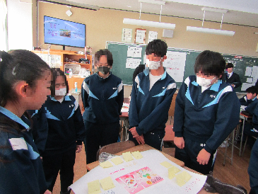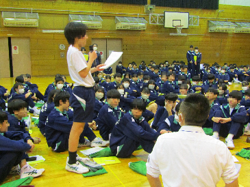 2月3日に生徒集会がありました。保健委員会と給食委員会がコラボし、冬を健康に過ごすことについて『〇〇に負けない体』をテーマに、栄養や食事、手洗いなどの視点から、調べたことを工夫して分かりやすくまとめたり、表現したりして、全校生徒に発信をしてくれました。また、2月4日は舟戸学園と本町小学校が集まり、「地域学校保健委員会」が開催されました(舟戸小学校にて)。本校から保健委員・給食委員の代表生徒が出席し、前日の生徒集会での実践を発表しました。