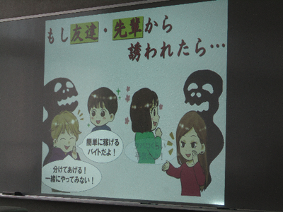 中学生の薬物乱用などの非行防止に向けて、誘惑に負けない心を生徒がもつことができるよう、「薬物乱用防止教室」を行いました。埼玉県警察非行防止指導班「あおぞら」から2名の方にお越しいただき、分かりやすいご講義をいただきました。学んだことを、今後の生活に活かしていきましょう。