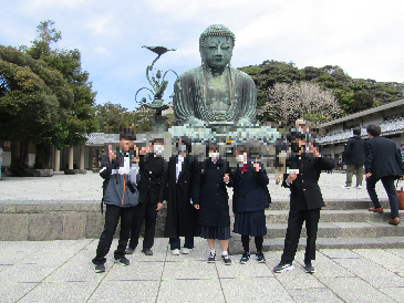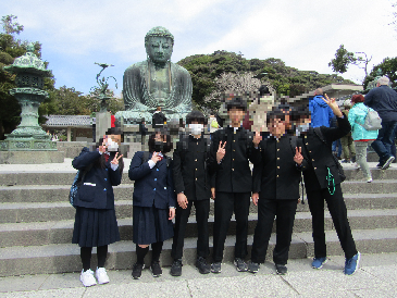 今日は2年生が鎌倉方面へ校外学習に行ってきました。今朝は冷え込む中での出発となりましたが、鎌倉方面に到着するころには天候にも恵まれ、班ごとに校外学習を楽しむことができました。スローガン「春は鎌倉 歴史を学び ルールを守ってレベルアップ」に向けて、多くのことを学ぶ一日となりました。