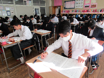 新年あけましておめでとうございます。3学期がスタートしました。昨日は始業式、本日は、2年生は実力テスト、3年生は校長会学力テストを行いました。1年生は発育測定を行いました。まとめの3学期です。これまで身に付けてきた力を存分に発揮しながら学び合い、次の学年、校種などに進むのが楽しみになるような3学期にしていきましょう。